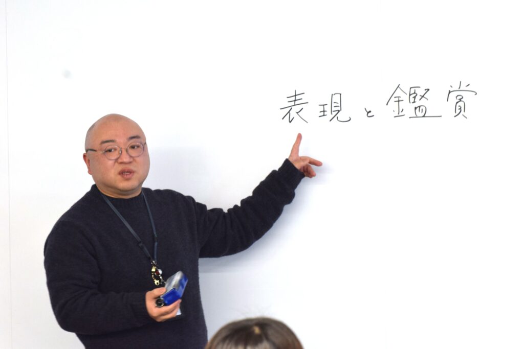 はじめに、看護学科の堀田助教より、図画工作・美術とはどのようなことを学ぶ教科なのかについて説明があり、有名な作品を題材に、絵から感じ取れる情景などについて想像を膨らませながら、参加者同士で意見交換をしました。
