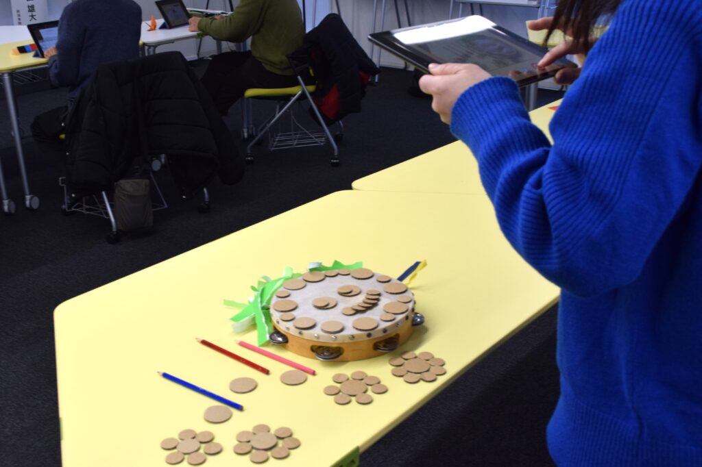 演習では、タブレットを使用して、実際に小学校の授業でも取り入れられているコマ撮りや逆再生の撮影体験を行い、楽器やペン、折り紙など、 身近にあるさまざまなモノを使い、思い思いの作品を制作しました。
