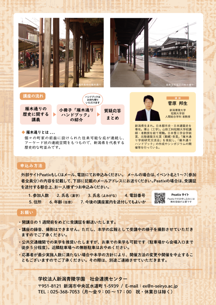 申込締切日までに、外部サイトPeatixもしくはE-mail・電話にてお申し込みください。メールの場合は、イベント名と以下1~7(参加者全員分)の内容を記載して、社会連携センター(ex@n-seiryo.ac.jp)にお送りください。Peatixの場合は、受講証を送付する都合上、お一人様ずつお申込みください。